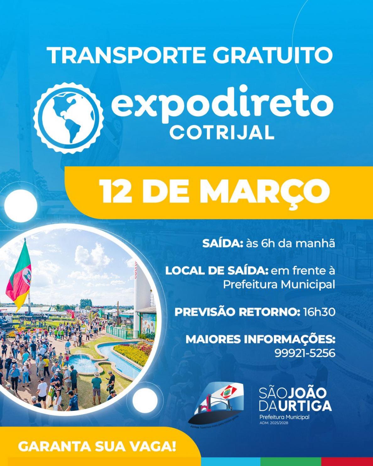 A Prefeitura Municipal de São João da Urtiga estará disponibilizando transporte gratuito para quem deseja visitar a Expodireto em Não-Me-Toque.