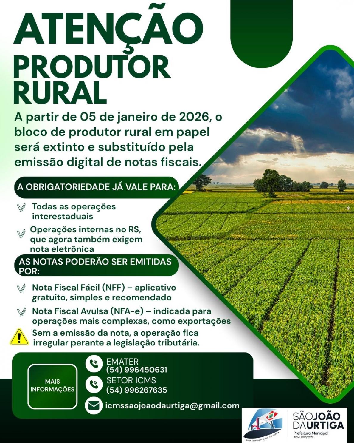 Maisinformações podem ser adquiridas no Setor de ICMS e na Emater. Contatos pelos telefones (54) 996450631 (EMATER), (54) 996267635 (WhatsApp) ou pelo e-mail: icmssaojoaodaurtiga@gmail.com
