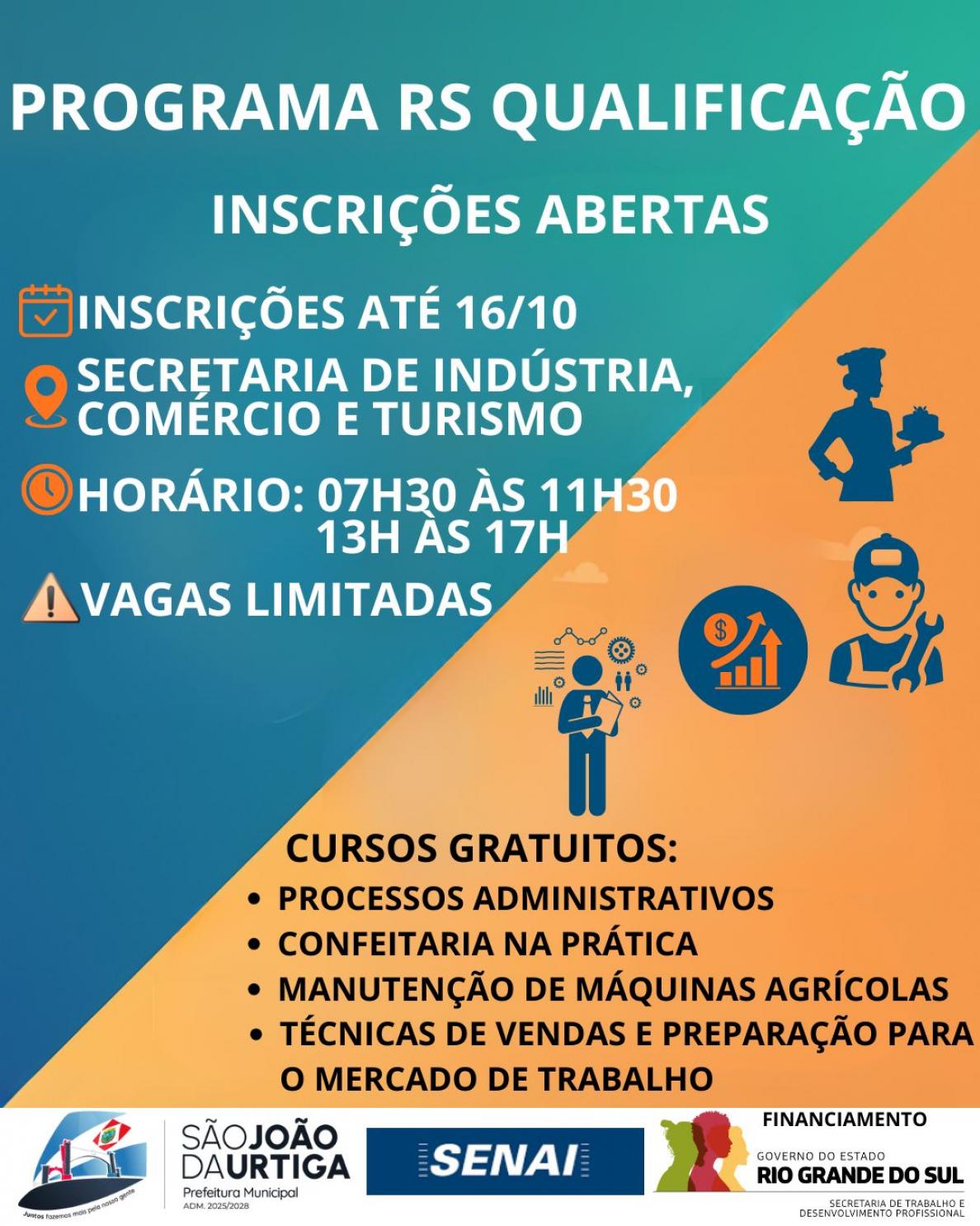 A Prefeitura de São João da Urtiga, por meio do Programa RS Qualificação, está oferecendo uma excelente oportunidade para quem deseja se preparar melhor para o mercado de trabalho. Os cursos são gratuitos, voltados para pessoas desempregadas ou subocupadas, e têm aulas previstas entre outubro e dezembro de 2025. As vagas são limitadas, por isso, fique atento aos prazos e garanta a sua inscrição!