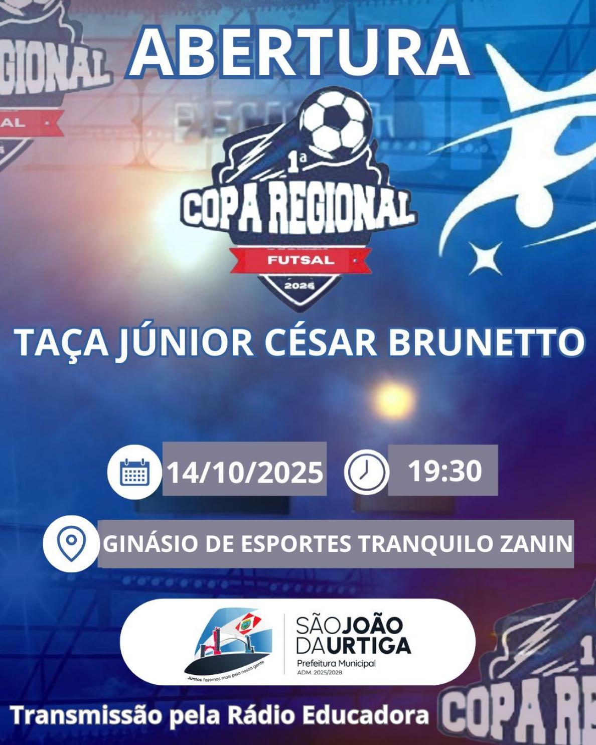 A Administração Municipal de São João da Urtiga e o Departamento de Esportes têm a honra de convidar toda a comunidade para prestigiar a abertura oficial da I Copa Regional São João da Urtiga – Taça Júnior César Brunetto, uma homenagem especial a quem tanto contribuiu para o esporte local.