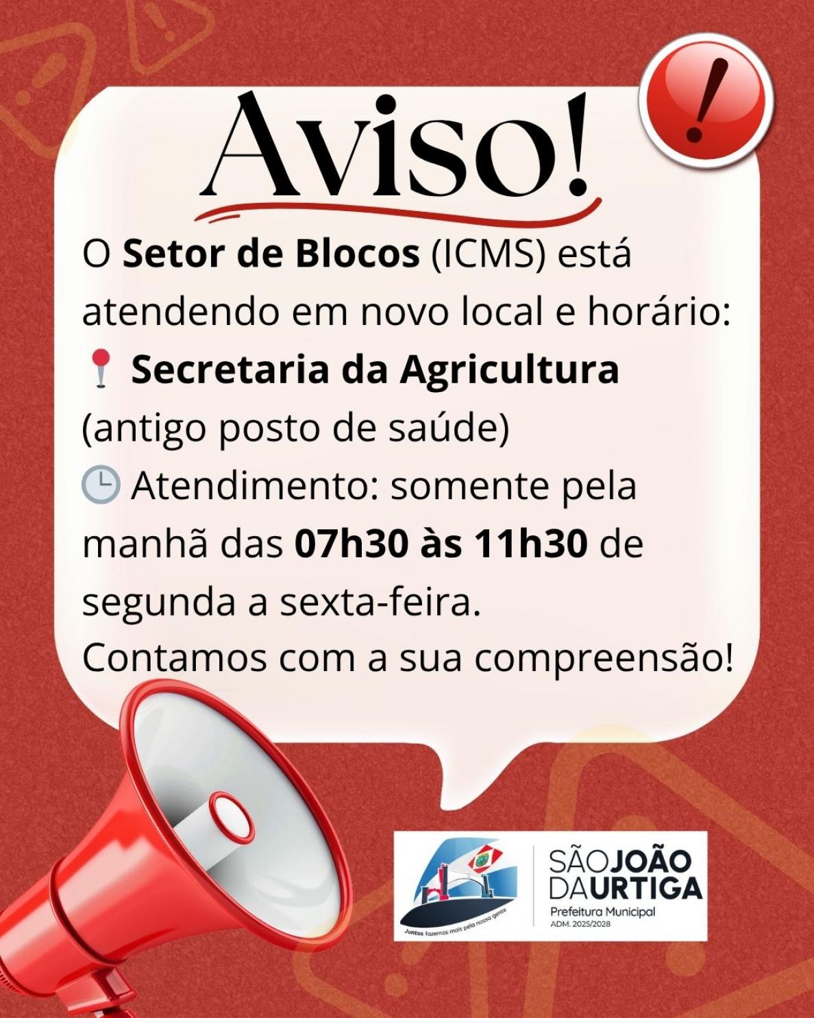 A Prefeitura de São João da Urtiga informa que o Setor de Blocos (ICMS) está em funcionamento nas dependências da Secretaria da Agricultura, localizada no prédio do antigo posto de saúde.
