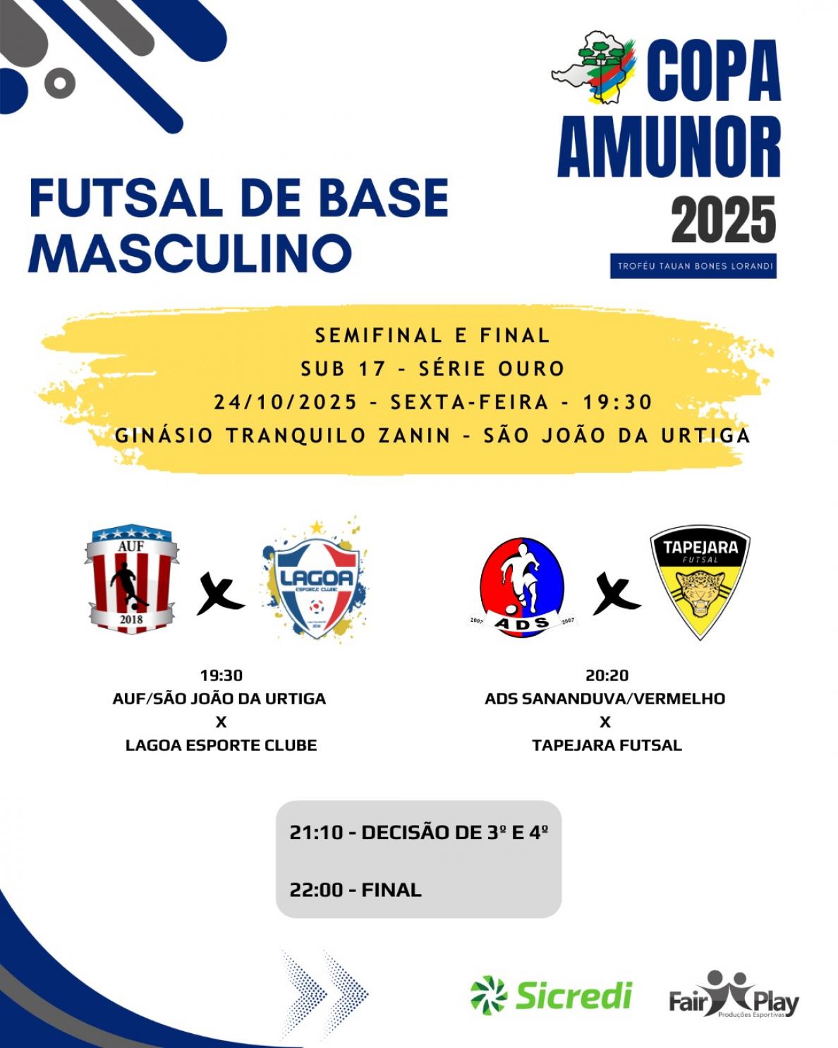 Sexta-feira, 24 de outubro Às 19h30 Ginásio Tranquilo Zanin – São João da Urtiga É dia de decisão! Venha apoiar nossos jovens talentos na grande final da Série Ouro Sub-17 da Copa Amunor 2025. Sua torcida faz a diferença!