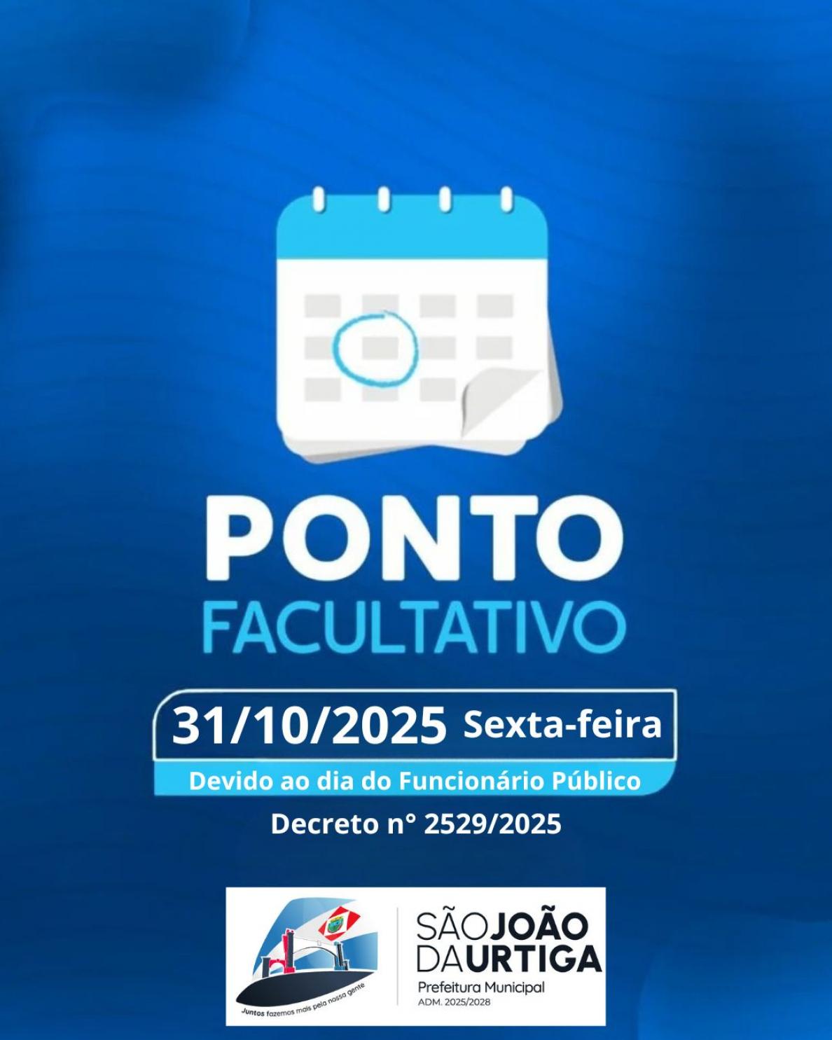 Conforme o Decreto nº 2529/2025, o ponto facultativo do Dia do Servidor Público foi transferido do dia 28/10 para o dia 31/10/2025. O expediente nas repartições públicas municipais será normal no dia 28/10.