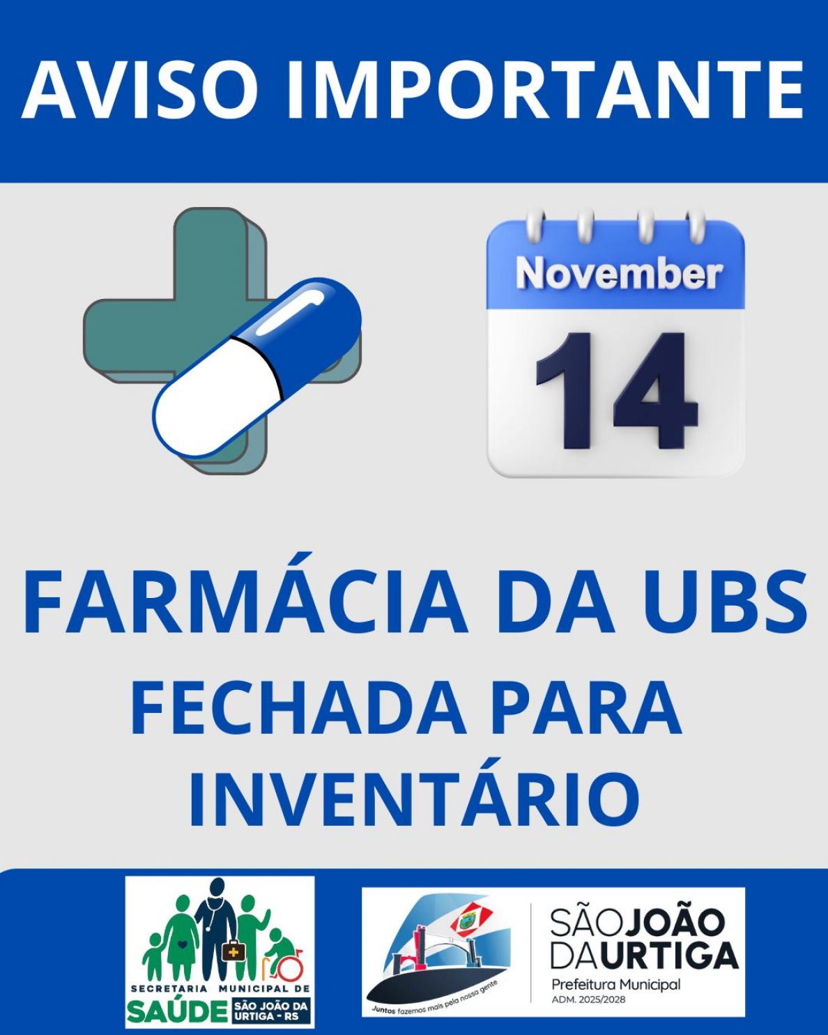 Atenção! Na sexta-feira, dia 14/11, a farmácia da UBS estará fechada para realização do inventário de final de ano. Não deixem para esse dia a retirada das medicações! Organizem-se com antecedência para evitar imprevistos.